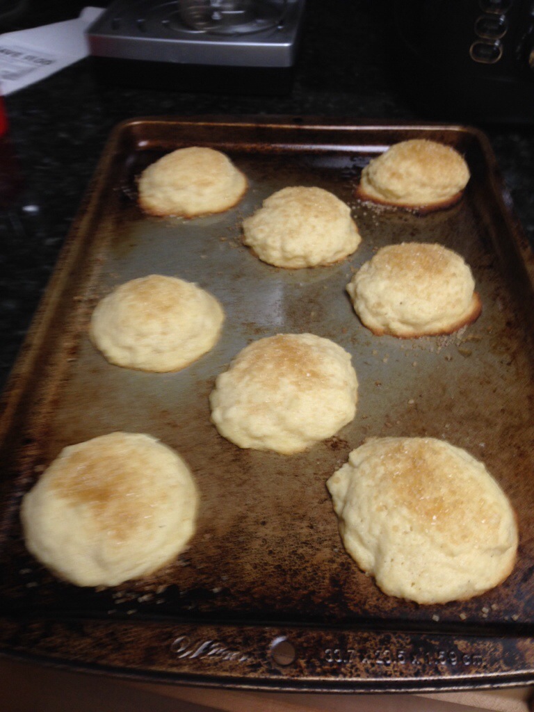 Take the mix out of the fridge and preheat your oven to 375. When it’s heating, spoon out your cookies onto a sprayed cookie sheet. I like to use an ice cream scoop! I put a little raw sugar on top to make it look pretty and give it a nice crunch. Just a little though!