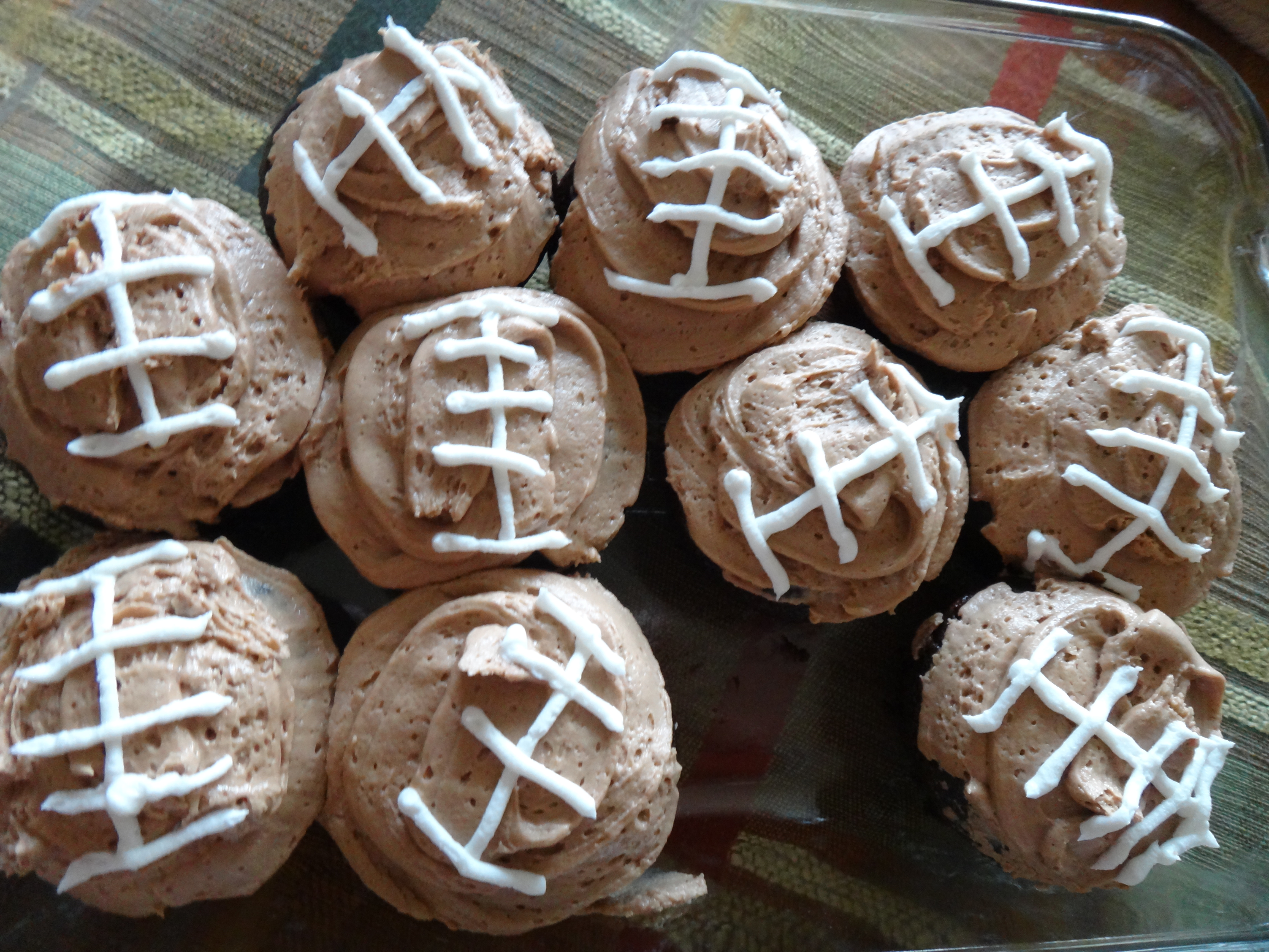 Before frosting, make sure the cupcakes have cooled. I made these cupcakes for the game last Sunday. I frosted the cupcakes and piped the laces. They were great and a fun occasional treat. These would also be fun for St. Patrick’s Day, and just add a little green food dye/remove laces!