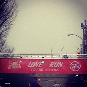 Race morning my husband and I walked to the start. Yes, the start was .7 miles from our apartment so we strolled over (awesome). Β The race organizers themed everyone’s bib. If you were single it was green, gold for it’s complicated, and red for in a relationship. There were cute nicknames too, like co-dependents, stupid cupid, and single n’ mingle. Β (I think, but that last one doesn’t seem right.)