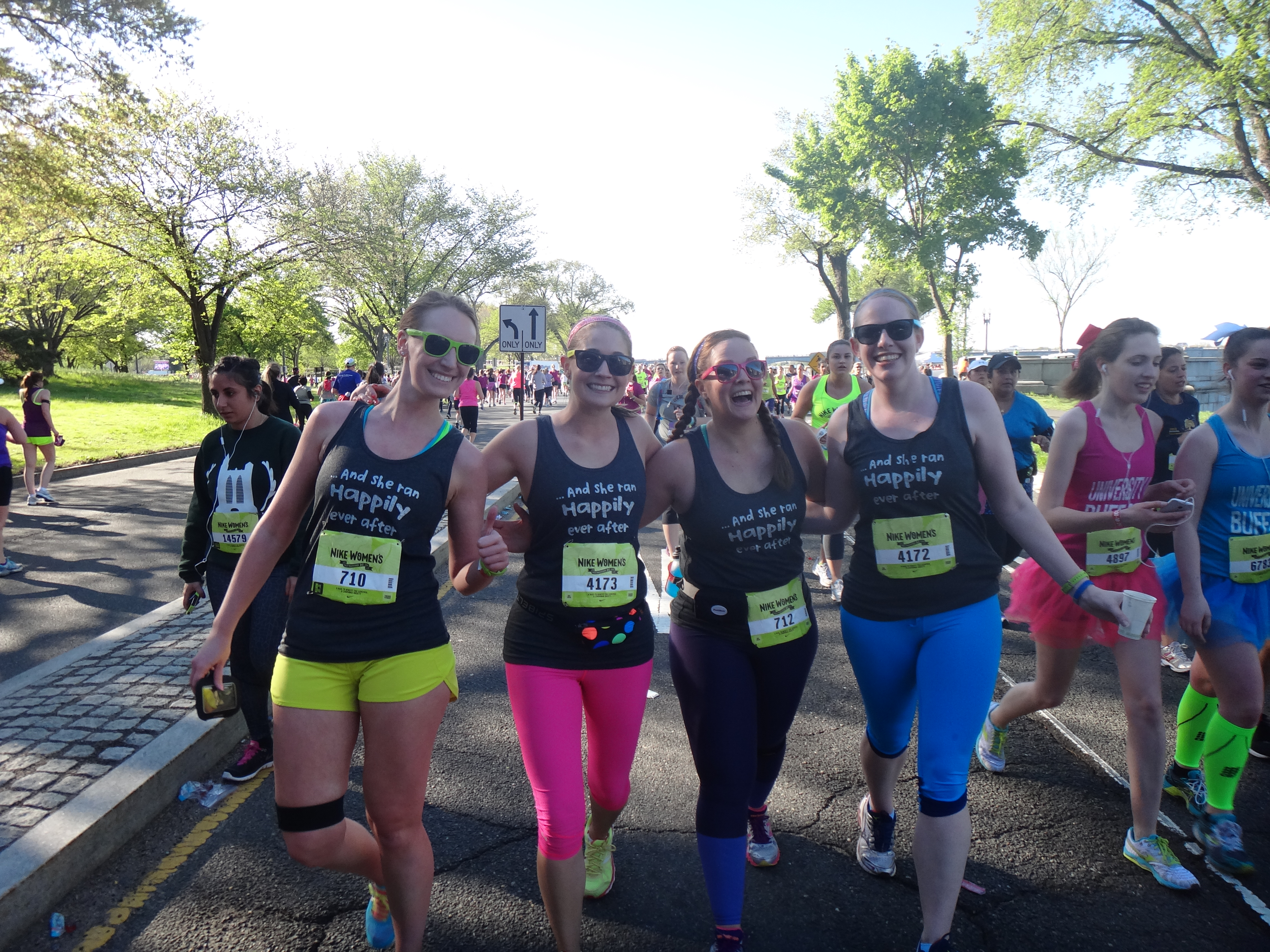 Afterwards, we fought our way through the crowds to get to our “wave.” While waiting for the start we took more pics and I downed my first GU of the day, plain in case you were curious. I consumed another at mile 5 and one at mile 10ish… Salted Caramel and Espresso Love. YUM! My friends and I decided that if we were doing this together then matching t-shirts were a top priority. The front said “And She Ran Happily ever After” and the back said, “Proof that a pair of shoes can change your life!”