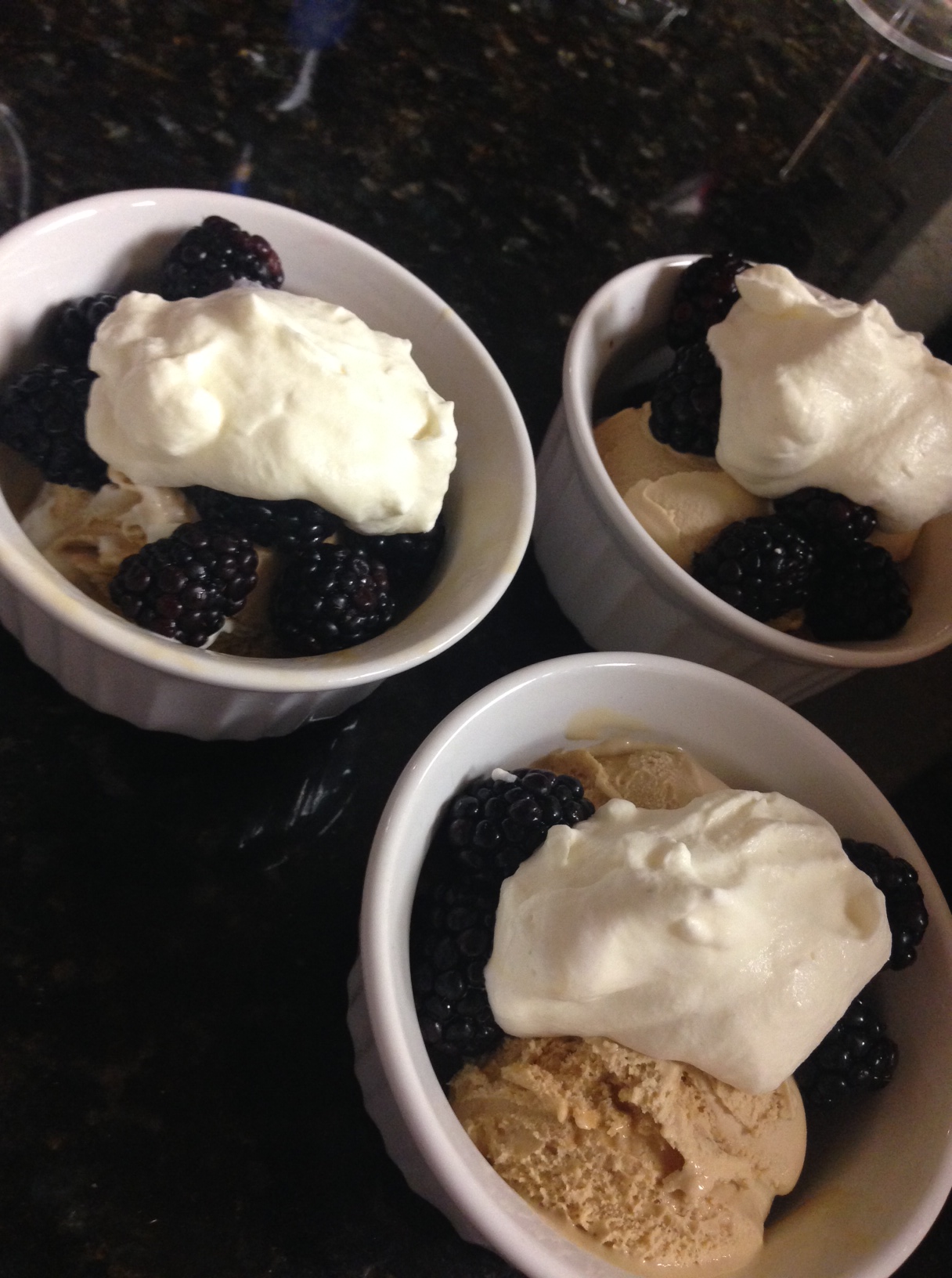 Use a ramekin to help with portion control. Place 2 small scoops in each ramekin. Put a small handful of cleaned fresh blackberries on top. And put a dollop of your homemade whipped cream on top!