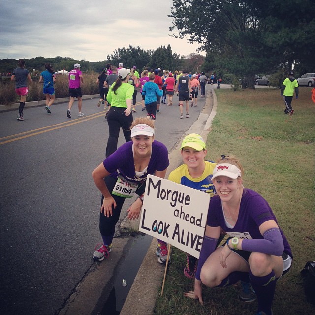 There are a lot of hills during this race. So Christine and I came up with the plan early on to walk up and run down. Great Plan. At one point we actually shouted, “I love gravity” while running down a hill. Who cares if fellow runners look at you like you’ve escaped an asylum? Spectators were so friendly during the race. Since Christine and I coordinated our purple outfits, people assumed we were team Ravens. In Baltimore, that’s plus. We even had a little girl run with us for 2 blocks and tell her parents she was now part of team Raven. Christine did most of the talking. I’m terrified of stranger’s children… what do you say to them?