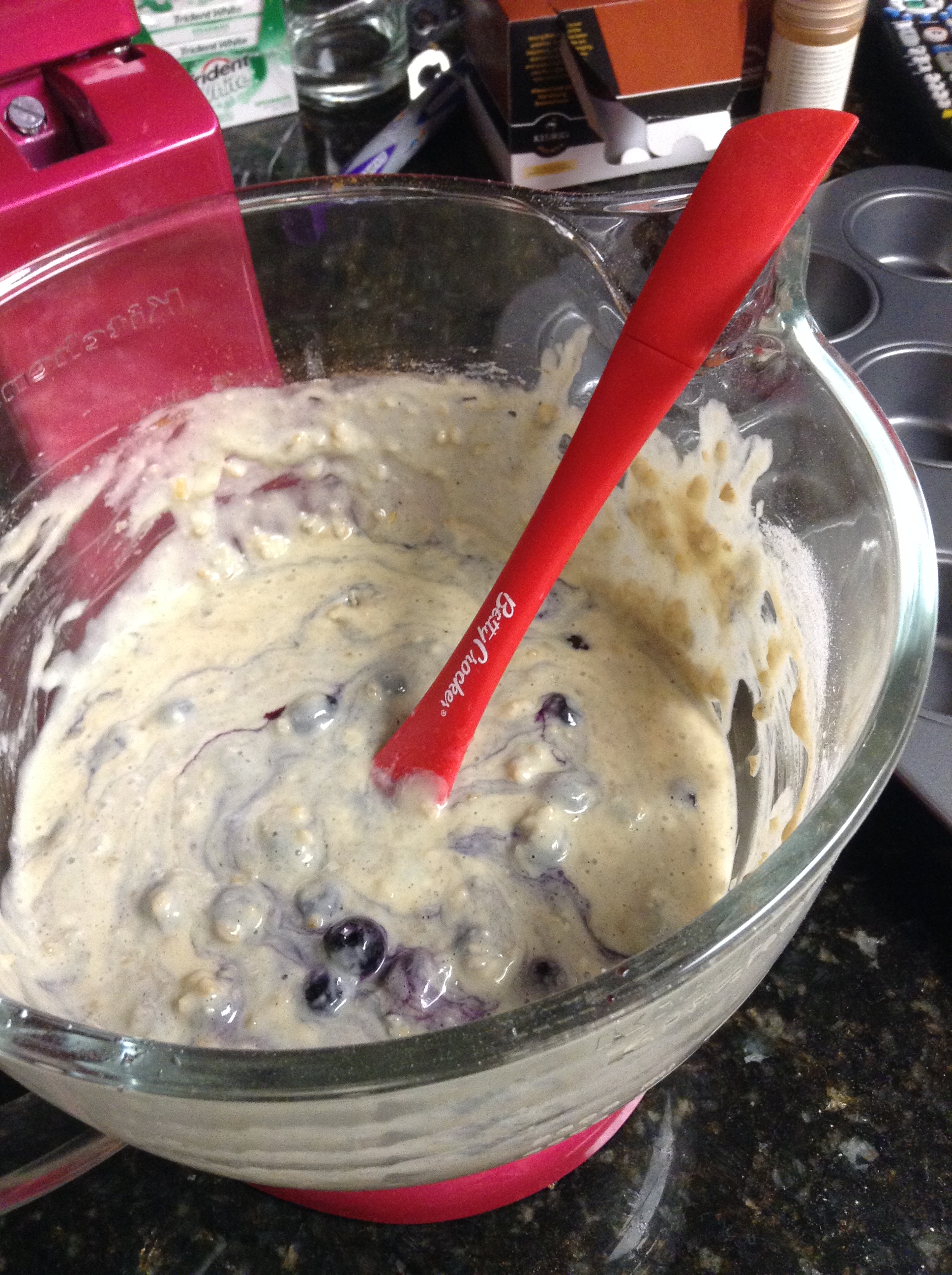 Fold in Frozen Blueberries.(Frozen helps them maintain their blueberry shape while cooking.) Do not heavily mix or it could destroy the Blueberries. So just gently blend by hand.
