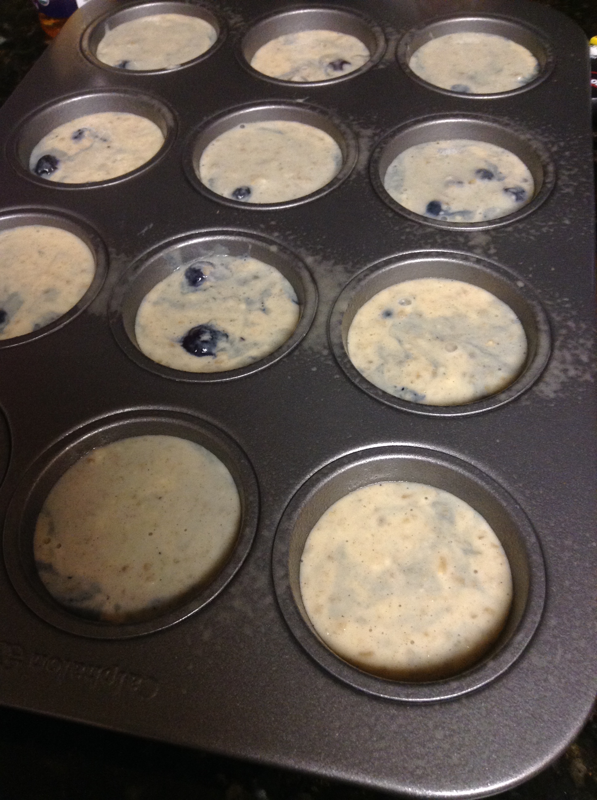 Grease/spray your tins. I use the Pillsbury baking Flour spray. It works well and you don’t need paper wrappers for your muffin tins. Fill the muffin tins about 2/3. They will expand in the oven, make sure to give them space!